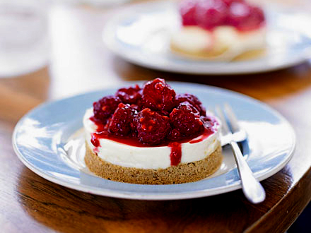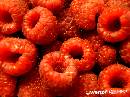 覆盆子又稱樹莓, 是一種荊棘野果, 與玫瑰一樣同屬薔薇科植物. 夏天開花結果, 通常持續到8月. 覆盆子有著脆弱嬌嫩、網狀紋理的果肉, 甜中帶酸. 成熟後其顏色變成鮮紅, 那嫵媚誘惑鮮紅的光澤讓人垂涎欲滴. 而最好食用覆盆子的方式是從樹上摘下直接吃, 當然得小心被荊棘. 另外食用覆盆子的方法也很多, 從裝飾、製成風味獨特的果醬、或是放在果汁機中與優酪乳打成奶昔, 到令人無法抗拒的蛋糕甜點、冰淇淋… 坐在辦公桌前, 我做起白日夢想著晚餐的甜點, 眼前出現覆盆子起司蛋糕和一杯香濃的拿鐵. 一瞬間, 珍妮佛安妮斯頓完美結實的身材影像出現, 仿佛對我閃著紅色警示燈一樣, 頓時想吃覆盆子起司蛋糕的主意完全煙消雲散.