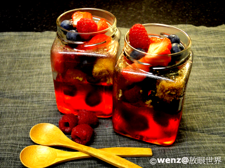 測量100ml煮沸的熱開水, 倒入耐熱的量杯中, 之後加入果凍方塊, 一起攪拌至到溶解. 然後加入400ml的冷水. 把500ml的液體倒入4-6個(在於果醬罐的大小)消毒過後的果醬罐內. 放入冰箱至少3個小時凝固定型. 約一小時後可先放入幾顆覆盆子於果凍內. 最後以藍莓、覆盆子、黑莓及切丁的蛋糕來裝飾, 覆盆子果凍罐子內變成飽滿厚實, 為這嫵媚鮮紅的果凍填加香氣濃郁的水果味