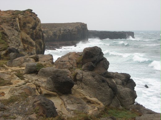 遊小門嶼,鯨魚洞是聞名的景點,玄武岩海拱造型奇特而壯觀。其實退潮時沿岸邊潮間帶繞行全島,尚可發現許多海崖地形更值得流連觀賞。上個月底學校舉辦戶外教學,七年級選上了鯨魚洞,本想趁此機會舊地重遊,好好來一次「環島之旅」,誰知當天天侯不佳,風高浪大,又值漲潮,無法如願成行;只能在山崖上獵取一些「驚濤裂岸」的影像。只拍了幾幀,相機電池秏盡,備用電池又沒隨身攜帶,真叫人懊惱。