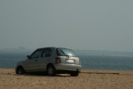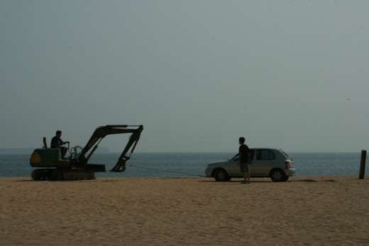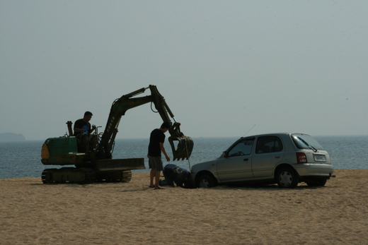 看著「輪」陷的轎車,當下心中浮起的念頭就是「活該」!剛由停車場走上沙灘時,明明看到了車輛不得進入的告示牌,怎會有人視若無睹,仍然我行我素,大喇喇地把轎車開上沙灘?無視禁令,又完全不知愛惜自然環境,其心可誅。動彈不得的狼狽完全是咎由自取。過了一陣子,一台怪手緩緩駛來,鈎上繩索,拖吊牽引,終於將轎車拉到較硬實的土地,車主這才將車開走。救兵來自何處不得而知,應該是「輪」陷轎車的車主雇來的;一趟救援,總免不了花些工資油錢吧,希望怪手司機狠狠敲他一筆!