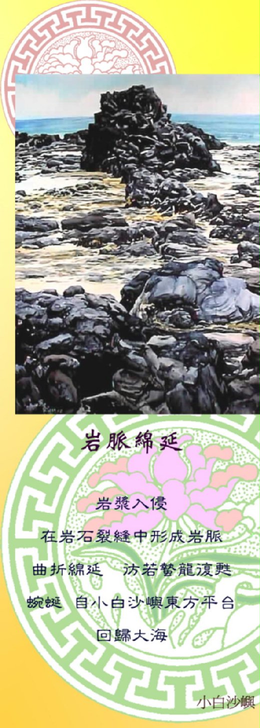 岩漿自岩石罅隙迸出,凝結成板狀直立的岩體,是為岩脈。小白沙嶼東岸海蝕平台上,黝黑的岩脈貫穿多孔狀的玄武岩層,東西蜿蜒約有百米之長。