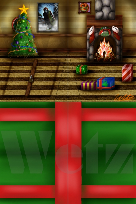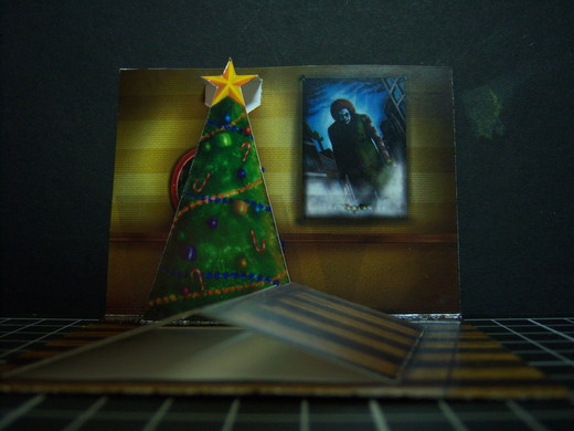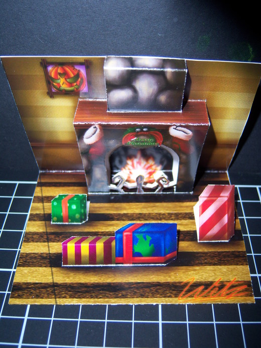 大家應該有發現到,內頁地板裡各有個斜線,那是做什麼用的呢?如果您沒把他做成二張,而是合起來做成一張卡片的話,那二條線就有用啦,中間的線把他折成凹的,旁邊的斜線折成凸的,把多出來的部分向左或向右折,這就是個聖誕節房間的場景圖啦~