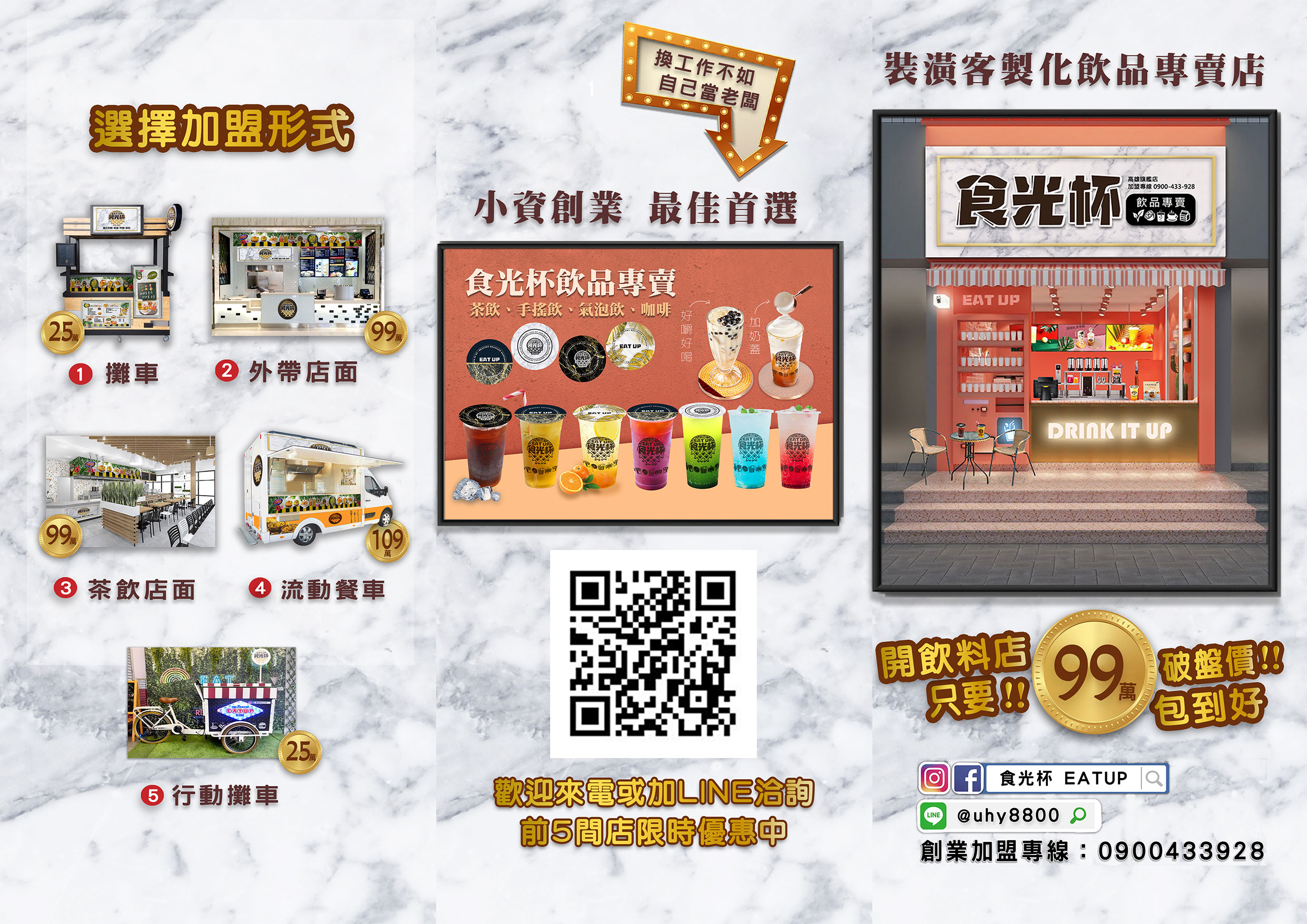 破盤價!開飲料店,總金額只要99萬包到好,已包含店面內外裝潢及設備、教育訓練、食材物流配送!無需額外費用!優惠價進行中!敬請把握機會!