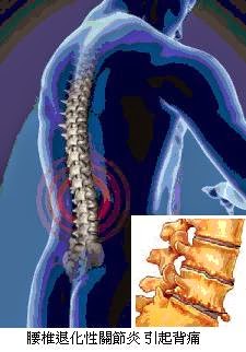 2. 脊椎的退化性關節炎:脊椎也像膝關節一樣,是身體負重的關節,因此也會退化;通常是椎間盤變乾癟、萎縮或破裂了,有些則常常是椎體後方的小面關節過度磨損,這是小面關節的退化,會使脊椎 節與節間變鬆,動作的磨擦變大,會造成晨起僵硬,走路走久、站久會背痛。
