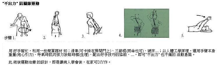 病人可在術後第一天,即進行運動治療。又為了避免動作不當影響傷口癒合,作者也設計了一套「不出力(assisted / effortless)的肩運動;應用人體工學配合簡單的力學原理(如 地心引力、手臂本身重量、滑輪、三節棍、姿勢、…),教會病人用好手幫患肩做動作,只須少許力、甚至不出力,就可啟「動」肩活動 (圖3),