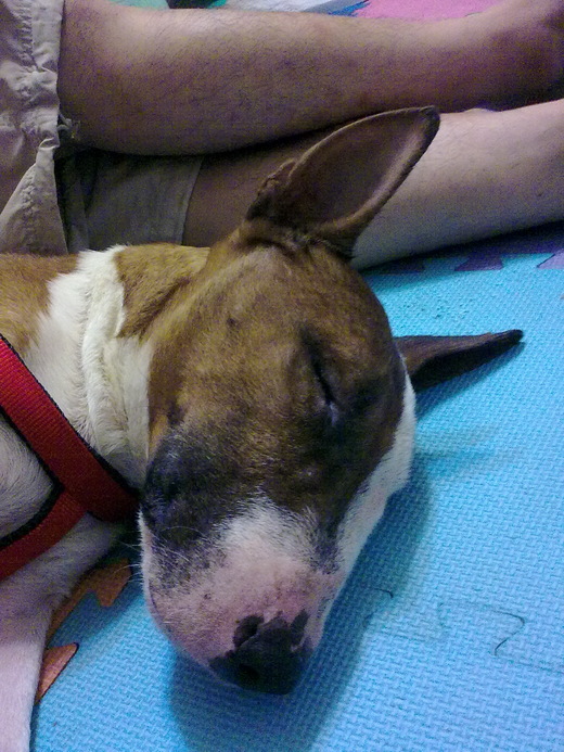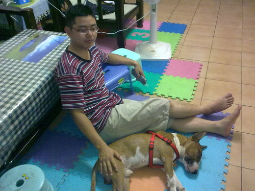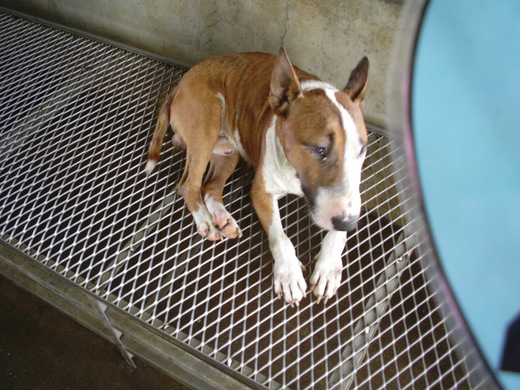 回到桃園後, 直接把Jimmy送去動物醫院檢查, 裝晶片, 做結紮手術, 打預防針, 再用[藥浴]狠洗一頓. 林醫師先是很詫異的說:[牛頭梗是數量很少的寵物狗, 怎麼會有人把牛頭梗遺棄?],跟著邊檢查, 邊又對著Jimmy(林醫師建議把狗兒改名叫 - 阿牛)說:[Jimmy, 你出運啊啦!] 林醫師說Jimmy大概四/五歲左右, 有皮膚病, 有心絲蟲, 眼睛也有發炎, 身上有被咬傷的小傷口, 應該是在收容所裡與其他狗打架而造成的傷口, 其他都還好. 告訴你們喔, 清理乾淨的Jimmy, 雖然長得[很機車], 可是與在竹南時相比, 可是判若二[狗]呢!