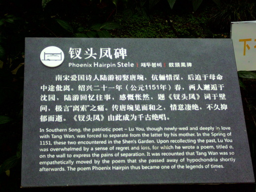 遊園的當天, 我們特別請了一位解說員為我們講解. 尤其在朗誦這首<釵頭鳳>時, 她的聲音非常好聽, 特別是唸到[錯 錯 錯] [莫 莫 莫]時, 突然一種感傷湧上我們的心頭, 彷彿看到陸游和唐琬的無奈, 怨和無言! 我也想起早期的民歌時代, 包美聖唱過的那首< 釵頭鳳 >, 大家還記得嗎?!