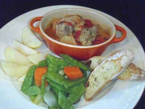 white女人的朋友點的是「利莫內茄香燉豬佐青蔬」(單點275元、套餐395元),據說是法國某些地區除夕夜必備的菜色,調入新鮮番茄慢煮而成的豬梅花肉,搭配以奶油燉煮的蔬菜及水煮洋芋,非常傳統的法國家常吃法。