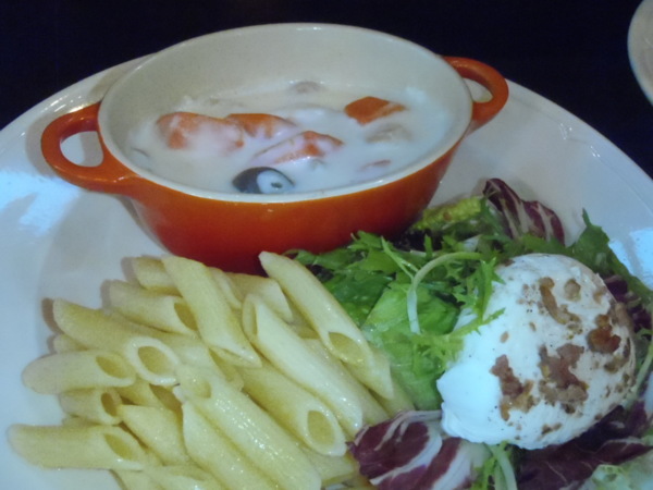 抵檔不了新菜的誘惑,我們又合點了「奧弗涅奶油燉雞佐筆管麵」(單點275元、套餐395元),white女人覺得這道料理,以白醬燉煮的去骨雞腿肉口感十分濃郁,搭配新鮮沙拉和偏酸的油醋醬,恰好可中和白醬的厚重感,隨餐附的中空筆管麵,佐以小盅內的奶油白醬食用,也是一絕。