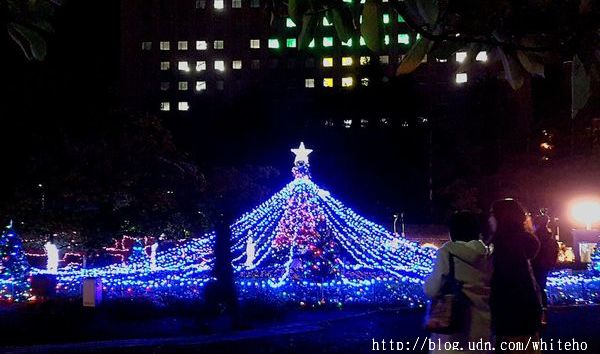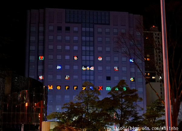 街頭許多建築物入夜後也投映出應景的聖誕燈飾。