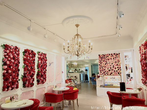 餐廳內可大分為三大用餐空間,以一樓甜點櫃畫分,靠近入口處座位區最大的亮點是玫瑰花牆