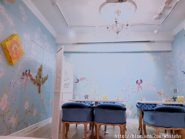 甜點櫃旁走道一邊是可通往B1的樓梯,一邊是可往內走進較為靠近後方吧檯為由藍綠牆面上的花鳥圖紋及藝術展品所打造出的另一種氛圍的較隱密空間