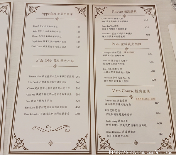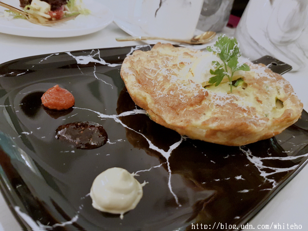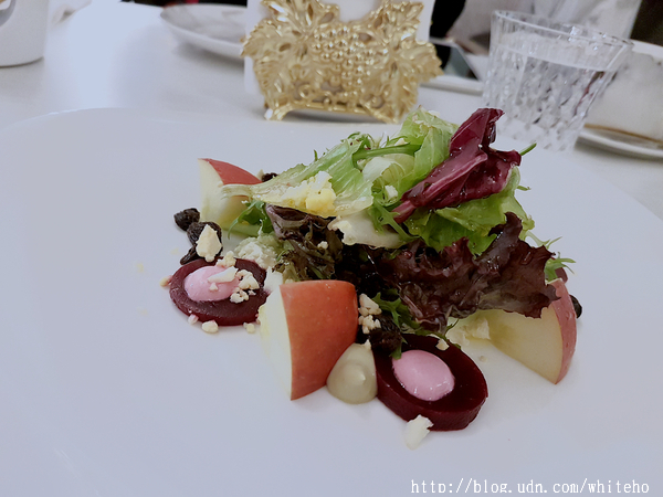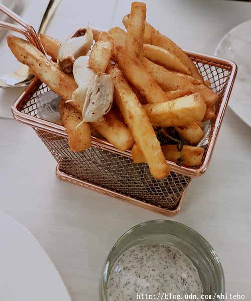 用餐氛圍令人賞心悅目,餐點料理本身也不馬虎,據說是聘請在業界小有名氣的主廚JAY來擔任,JAY曾是知名時尚餐飲品牌蜜糖吐司、跳舞香水的研發主廚、Nisoro的餐飲總監,更在法樂琪、教父牛排館服務過,廚藝精湛富創意且融入時尚擺盤設計。當天我們一人點了一份主餐,另再點選一些前菜、甜點一起分享。