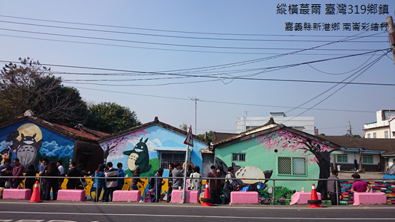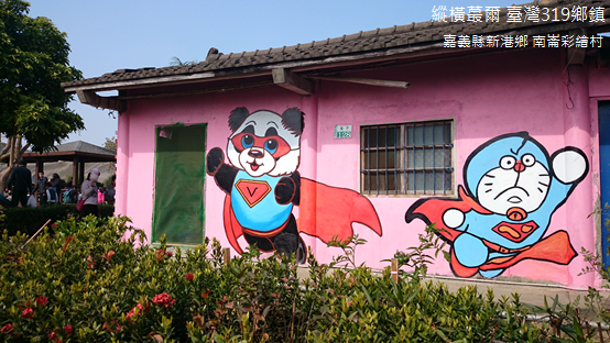 同樣是在民房上彩繪圖案,北崙村主要是將牆面、窗戶或是門廊塗上繽紛色彩,南崙村則是以「龍貓」為主題,讓街坊巷口到處都可以見到「龍貓」或是其他卡通圖案。登上河堤俯瞰,崙子橋上貨車運送時蔬熙來攘往,橋下遊人摩肩擦踵,各自有各自的收穫,各自有各自的富足。