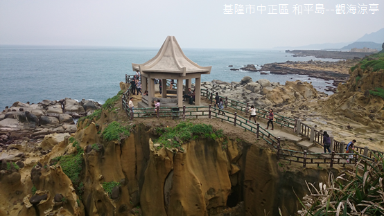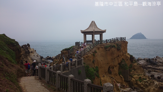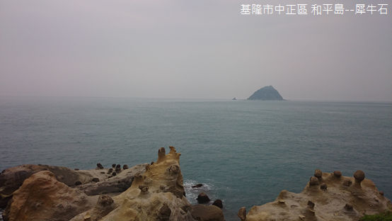 小心翼翼扶石橋越過海蝕溝,一尊涼亭超然蹲坐在石礁上,憑欄遠眺,怪石嶙峋,碧波萬頃,基隆嶼巍然把守海天之際,我嘗試將鏡頭伸長拉近,那島嶼依舊隔著一派薄霧無法描繪清晰,數百萬年前火山噴發遺留下鯨魚一般的身軀,頂上隱約可見黑白相間的燈塔。