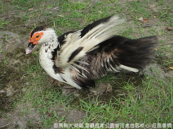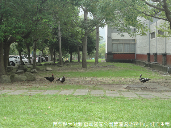 步出穿堂,一鏡水潭被草澤所環繞,周圍步道可以深入其間,但是我卻先被徘徊在地磚上的紅面番鴨嚇著,雖然曾經在信義鄉許多部落看過眷養的豬隻,或是散發沼氣般臭味的雞鴨圈,眼前兩隻番鴨安逸地走在草地還是第一次見過,想是拜國家公園所守護,連家禽都能安詳自適。