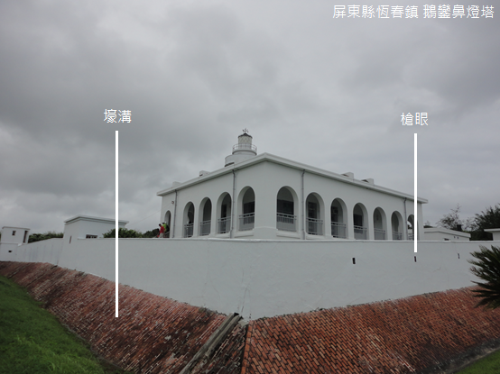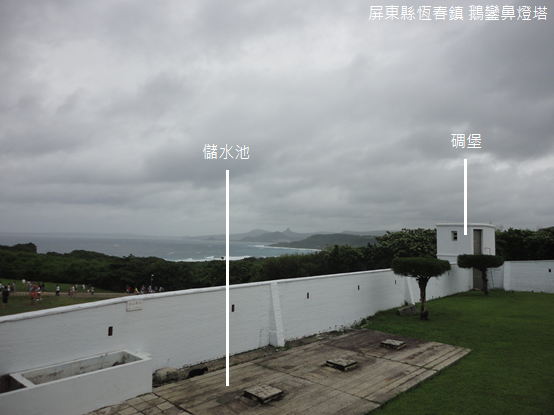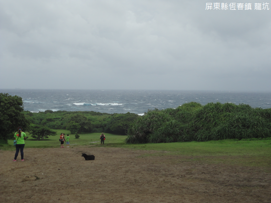 朝龍坑方向遠眺,綿延林投被強風所折服,近處草地已經被川流足跡消磨,最遠處的巴士海峽失去鮮麗色澤,披上灰暗魅影,數尺高長浪清晰可見,猶如凶險蛟龍猖狂橫行,有些男女老少依舊按著髮絲,如臨深淵一步步順著濱海步道走向「臺灣最南點」,我們則轉身折回石板路,踏進燈塔入口,圍牆外圈的壕溝與槍眼一如往昔。