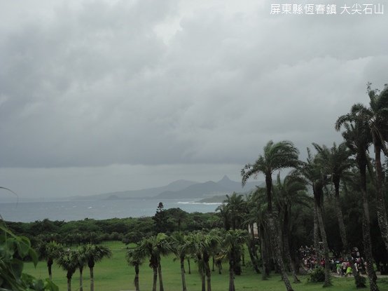 輕點微微雨絲走下高臺,林投開闊處視野遼闊,蒲葵與海棗成排成列挺立步道兩旁,樹林後方的海洋依著起伏山巒,山巒層層相疊,就好像新上色的水彩畫一樣,一抹藍中淡灰,再一抹深藍墨濃,三則點綴綠意,雲蒸礎潤,水氣淋漓,大尖石山屹立挺拔其上,整體看來彷彿是一派侏儸紀世界,也因為大尖石山屬於墾丁國家公園海拔最高處,只要一來到墾丁,很難不被它嶔崎磊落的架式所震撼,所以被設計當作國家公園的圖騰。