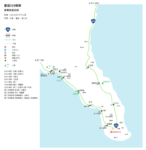 循屏鵝公路抵達恆春市區,與恆春北門以及東門擦身而過,嚮導手舞足蹈地告訴我們恆春搶孤的傳說,穿過芒草叢,他趕緊招呼我們朝車窗左側觀察,只見佈滿雜草的空地上聚集三兩人群,他們彼此圍繞在小小火炬面前「那就是『出火』,以後如果看到『出火』,就表示墾丁國家公園到囉!」,我們順著縣道200號遊覽滿州田野風光,沒有設置電線桿的阡陌盡頭牛羊優游,濱臨太平洋的彎路瞥見風吹沙與龍磐草原饒富野性的景緻。