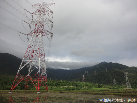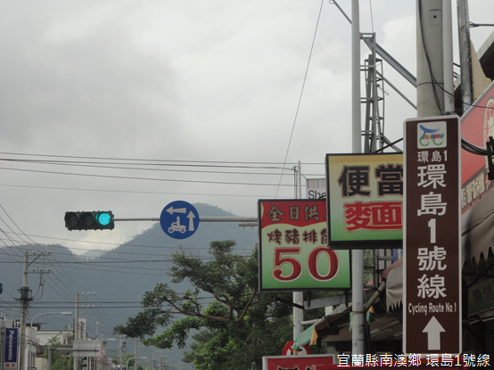 從蘇花公路折返南澳市區,接近火車站前順勢滑坡,隨後又奮力踩動踏板上升,依照地形起伏而建的臺九線兩側地面,都被標上藍底白箭頭,其上有自行車騎士騎自行車與數字「1」符號,我朝路旁街燈一瞧,才知道這段路已經劃為民國104年(2015)12月30日完工通車的「環島1號線」一環,只是沿途路況危險,多數人應該仍然直接由蘇澳新站搭乘火車到花蓮。