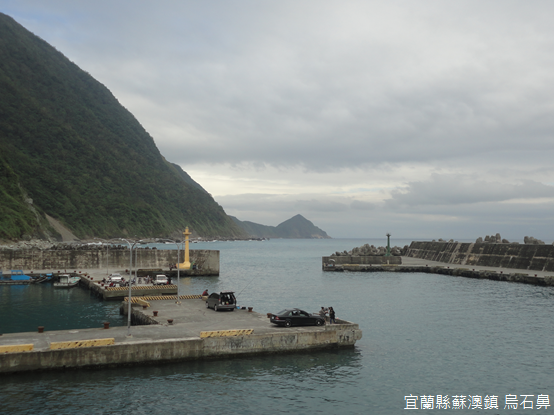 環顧四周,盤踞海上的烏石鼻陡峻且醒目,由地圖觀察呈現湯勺狀,從漁港觀看的角度倒是凸顯山稜的銳利,烏石鼻岬角主要是花崗片麻岩所組成,遭受太平洋洶湧浪潮時,相對比鄰岩壁更能耐得住拍打侵蝕。