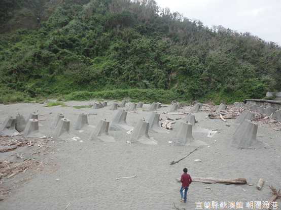 登上漁港海堤,兩旁海濱深受突堤效應影響,北面海岸向村莊退縮,南面卻向前推進積累出海灘,散落滿地漂流木外消波塊緊密排列,峻祥此時憑著一股好奇心,三步併作兩步爬上消波塊看海,消波塊有些形體完整,有些支離破碎,八成是不同年代投放的,跟隨我們後方,一行遊人走到海堤轉折處,對著山嶽指點一番,又匆匆折返村落。