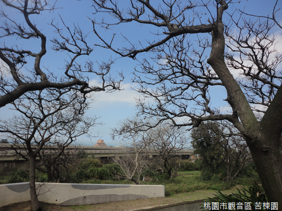 潔白似雪的牆邊,百年苦楝枯葉落盡,深青枝幹扭曲向外生長,宛若舞者兩人貼緊腳跟,背對背伸展雙臂;歲月的滄桑劃破衣袖,而她們依然堅持著對天空的仰望,不畏濕風,不怕鹹土,「苦苓子」垂掛樹梢,等待春神遞來淡紫色的幽香。