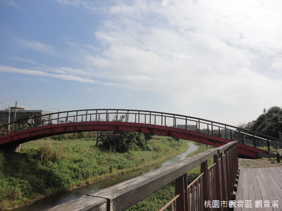 觀音溪畔,鐘塔廣場波浪狀的矮牆被漆上簡潔藍色線條,入口懸吊的銅鐘隨風輕響,獨自搖擺著聖托里尼島的夢,紅色拱橋跨過小溪連接彼岸菜園人家,兩岸茂密林投與人齊高,石製燈塔模型樹林中環狀排列;最特別的,是草叢間埋藏著1940年代興建的軍事碉堡,園區門口附近甚至設置防空洞,基地裡凍結的空氣封存戰爭肅殺氛圍,而它們都在森森苦楝林中找到自己的位置。