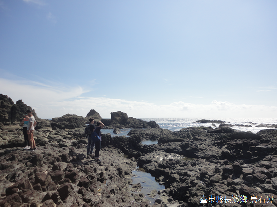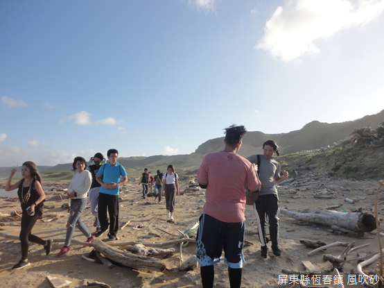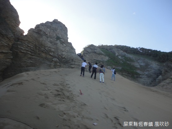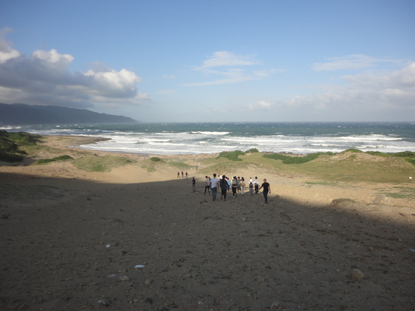 短暫的遲疑,正如老師所預言,困在風口前動彈不得,甚至懷疑自己能否全身脫困而毫髮無傷?不過,「水能載舟,亦能覆舟。」,我發覺海風劇烈的力道使人不容易撲倒,珊瑚礁岩粗糙表面也讓腳底不容易打滑,彈跳到沙丘上之後,和高竹儀相互扶持,終於順利與老師會合。