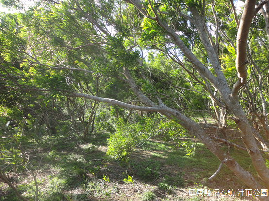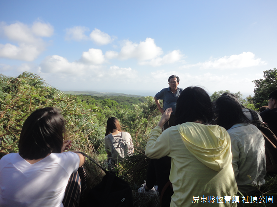 第三天的行程,主要是拜訪社頂公園和風吹砂,認識恆春半島特殊的珊瑚礁地質景觀,短暫休息於墾管處,便朝著墾丁國家森林遊樂區的方向前進,然而,平時熱門的觀星草坪卻不是我們的目的地,在老師的導引下,遊覽車停靠一處珊瑚礁岩壁前,緊接著,他跨過水溝直向相思樹林走去,樹林紛雜濃密,強風中枝條搖擺亂舞,草叢下則散佈碎石,使緊跟在後的我們有時躊躇,幸好距離不遠,很快地就尋找到一方空曠的草坪。