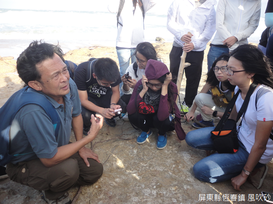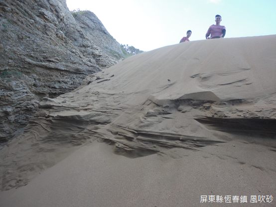 「從這些岩壁上,可以找尋到珊瑚礁的遺跡,這些遺跡分成兩種,一種是樹枝狀的,另外一種是珍珠狀的,生長型態的不同可以反映當時海水流動的緩急,愈是沒有海水擾動,珊瑚在平穩環境中愈容易構成樹枝狀的構造。」老師瀟灑地由沙丘快步走下,指著崖壁分析,眼見我們被風吹沙折磨得狼狽,索性故作不平地說:「啊我在講你們都不看我,那我不講了,走吧!」