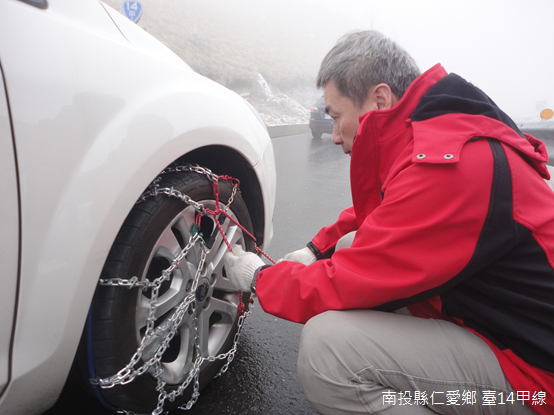 雪鏈安置齊全,車輪輾壓路面彷彿滾動碎石地上,發出「嗶嗶波波」的聲響,緩慢向前行,正式踏上合歡山冰雪秘境。