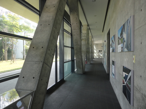 步入大廳,V形柱支撐起一整層樓的玻璃帷幕,也許是抗震設計,正好和美術館三角形的概念契合,顯得厚實且剛強;另外,最令安藤欣賞的地板鋪面也是三角形磚鋪成,平坦劃一,找不出切割的線條。