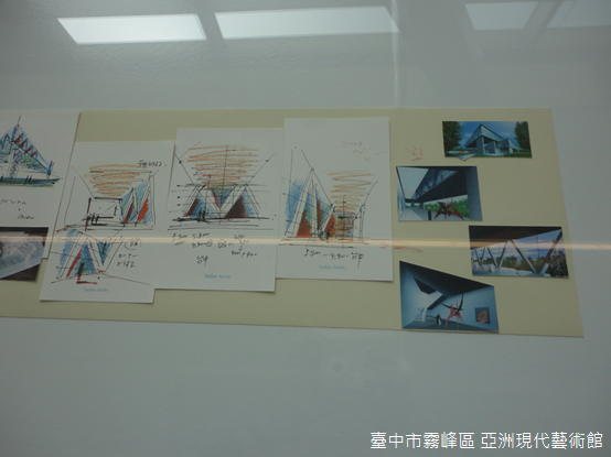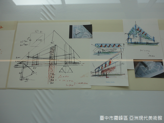 一樓的安藤講堂,是整間美術館唯一的木造空間,講堂外陳列手稿、建築模型,還有安藤過去參與的設計,安藤忠雄風靡全臺,吸引人們到霧峰朝聖,除了清水模純淨的質感,許多人甚至深受他人生故事所感動,日本建築界派系林立,如果沒有門閥支持很難有所成就,安藤出身貧寒,成績不佳使他無法升上大學,曾經擔任業餘拳擊手,如今卻成為日本建築界巨擘。
