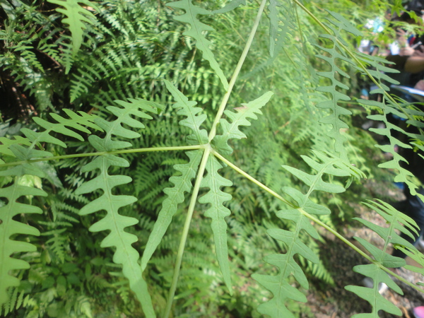 「第一個,先來介紹『腎蕨』,」她使用隨身攜帶的剪刀取下一段羽葉,裁成數段分配給我們,「一般來說,蕨類是羽狀複葉,每一個羽葉上都會排列數條『羽片』,『羽片』上再分岔出『小葉』,看起來跟其他被子植物的結構很類似,但是另外有自己的稱呼,連接『根莖』的部位叫作『葉柄』,然後『中軸』串連所有羽片,腎蕨小葉的外緣呈現圓鋸齒狀。」