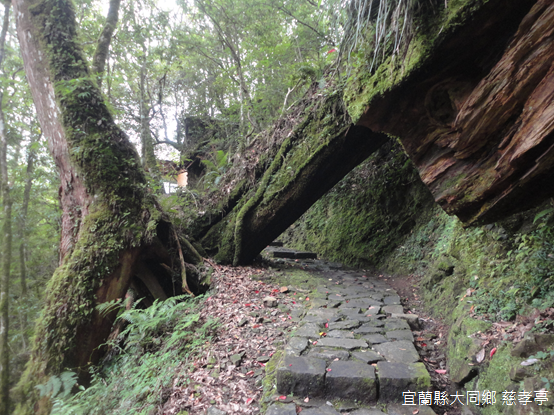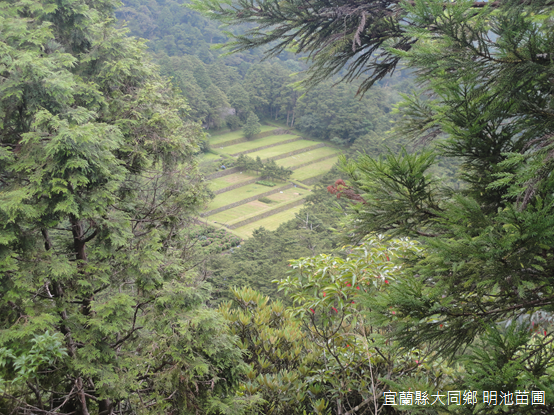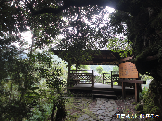 慈孝亭位居園區最高處,從步道轉階梯迂迴上升,鑽過斜倚山壁的倒木即可抵達,慈孝亭原名「慈亭」,是蔣經國先生為了紀念母親而興建,後來年久失修,經過退輔會森保處改建,並且新增「孝亭」,亭前樹木龍盤虎孥,憑欄俯瞰,明池全貌一覽無遺,面對蘭陽平原的方向,明池苗圃色彩青綠,好似梯田一樣層層疊疊。