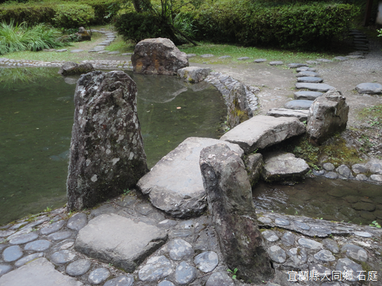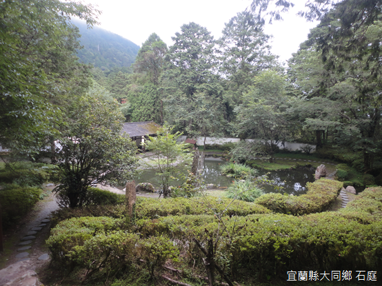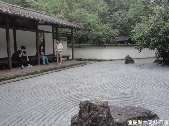 度過石板橋,思閔逕自走向禪亭,凝視著仰臥石庭內的一汪圓塘,如果明池的恢弘是映照眾生悲歡的明鑑,也許,圓塘正是投射個人哀樂的銅鏡,「現在眼前看到的是水池,如果你們往後看,另一邊就是『枯山水』。」我說,「哇!我喜歡這個。」彥彤聽到之後,不假思索地跑到後院,思閔和弟弟緊捱著腳步行走到廊柱下,父親和我則駐足木棧道上攝影。
