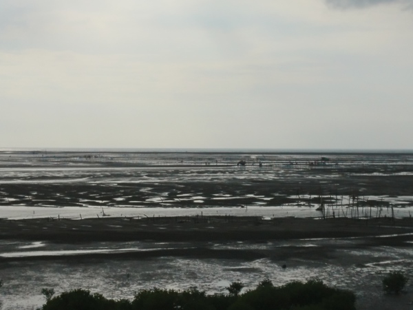 順著拱橋朝海濱行走,日光穿透雲隙灑落光輝,一種國畫中的留白,想到在同樣一座島嶼,北濱因為海岸蜿蜒曲折,還有岬角上奇岩怪石而著名,蘇花公路必經的清水斷崖,頂天立地而使人震懾,至於往來西濱,看似平淡寂寥,當下才曉得,只有從高處俯瞰,方能從行草般流動的線條,望見寬廣又沉靜的泥地上,河川與海洋千百年來宛轉的筆談。