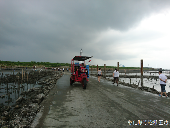 或許是風吹雨打,加上年久失修,從堤防延伸向外的賞鳥平台幾近廢棄,海堤有時也被雜草覆蓋,靠近燈塔一側遊人較多,環境維護較佳,一條路從燈塔附近翻越海堤,直向海天會延展,鐵牛載運無數觀光客來往,觀光客乘坐矮凳上,他們腳下內燃機排氣時引起陣陣爆裂聲響,一行人搖搖擺擺地任三輪馳騁著。