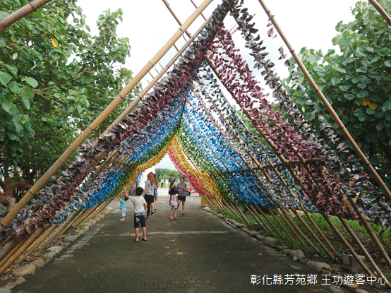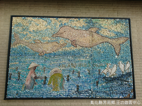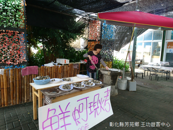 和芳苑燈塔相距不遠,遊客中心門前蚵殼藝術繽紛多彩,棚架底下,小販將蚵肉一一從殼內掏出,一旁桌上販售鮮蚵現烤,室內展示以蚵殼取材的作品為主,白皙內裡,粗糙表面,藉由光線投射,或者枯木、岩石陪襯,呈現樸拙質感,不過展廳缺乏室內空調,參觀沒多久就讓人汗流浹背,不得不走到港邊,吹吹海風,看看水道上漁筏擺盪。