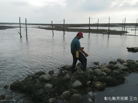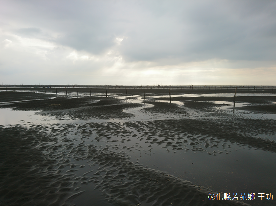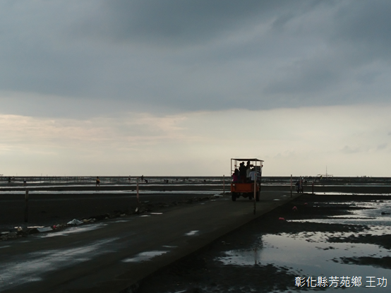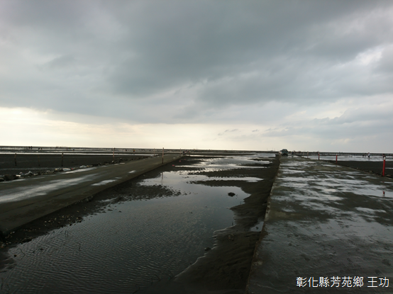 循水泥車道徒步前行,車後懸掛「打卡按讚」的鐵牛不止息地穿梭、交會,一側是垂掛成串蚵仔的蚵棚,遠方沙丘上風車旋轉,另一側洋溢印象派畫作的意境,沙地的起伏,水流交錯其間,烙印著光影變幻,黑與白組合成的灰階,是王爺宮前的滄桑,討海人和養蚵人安之若素的信仰。