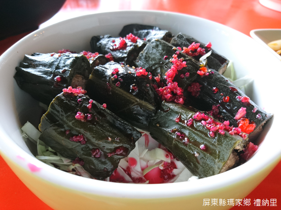 不只是藝術表演,廣場四周聚集許多攤販,販售芋頭、咖啡、小米酒等等特產,而最特別的當屬傳統美食「吉那富」,吉那富外觀像是壽司一樣,口感卻不太相同,粽葉裡還有一層假酸漿葉包裹著,內容則是小米、芋頭和豬肉為主,餡料的油膩和假酸漿的苦澀相互調和,各家作法大同小異,無論是在禮納里,或是三地門沿線都可以品嚐到。