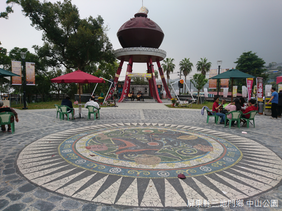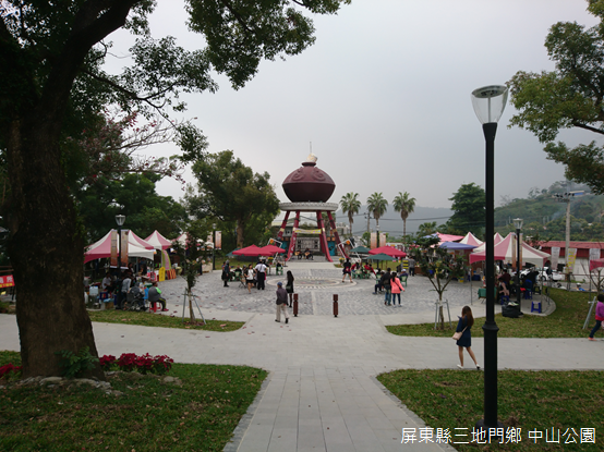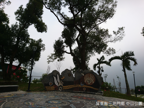 三地村由Timor、Talavatsa、Salalau三個聚落合併而成,是三地門鄉行政中心,臺24線在部落裡曲折蜿蜒,有些街屋門面開設甕缸雞燒烤店,或者排灣族藝術工坊,甚至連便利超商也在此落腳,對我來說,這個地方和其他部落的外貌相差不遠,只是往來車輛多了不少而已,至於中山公園距離鄉公所不遠,是過去神社所在地。