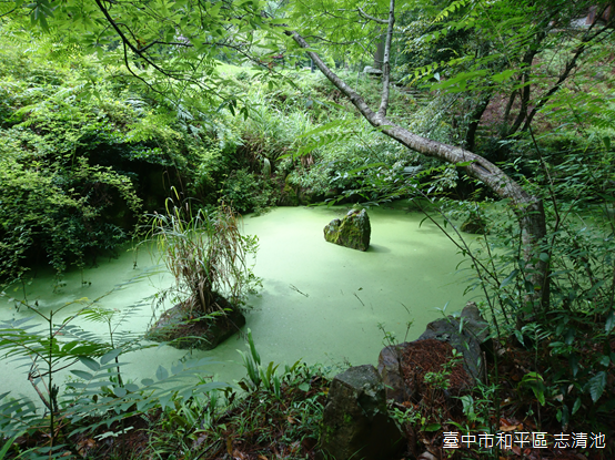 志清池畔的步道散佈落葉,甚至有些濕滑,池水則被滿滿的浮萍覆蓋,是一種奇異的鈷綠,又融合細緻的青瓷綠,池中有石,石上有植栽,帶有一股蕭瑟的美感;志清池和中正池、瑞元池,還有天鵝池池水相連,中正池中有中正亭,而在前天傍晚,天鵝池中吸引小朋友目光的一對黑天鵝,今天卻不見蹤跡。