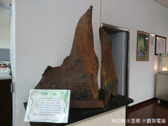 昭和19年(1944)10月13日,六架美國戰鬥機於7點45分轟炸大觀發電廠,山坡上運送潭水的壓力鋼管遭受重創,現在簡報室內仍保留一小塊破碎的鋼板,「日軍在二戰中戰敗,日本人離開臺灣時曾經說:『你們中國人是不可能修好電廠的,臺灣將會陷入一片黑暗。』,當然,他們所指的『中國人』就是『中華民國』,幸好,在孫運璿先生和工專學生的合作下,很快地又恢復運作。」