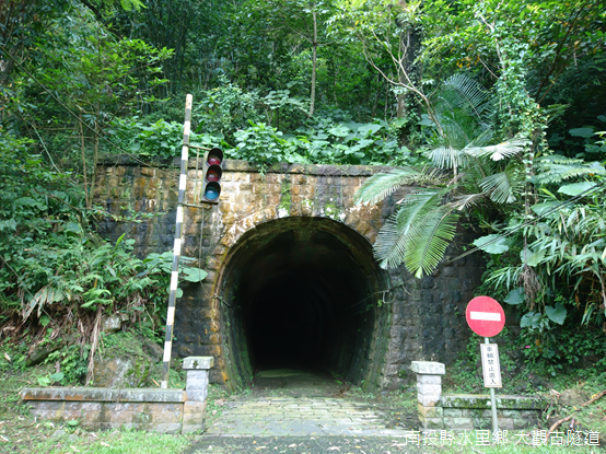 古隧道長度不長,卻因為路徑呈現S型,如果沒有手電筒照明,簡直伸手不見五指,岩壁滲出的水滴,一點一點匯聚成水流,順著隧道邊緣流向洞外,我們一步一步緩慢前行,伴隨著水聲淅瀝,眼前終於透出一絲光亮,走出洞外,越過大觀橋,彼端電廠門口的鳳凰木碩大且綺麗。