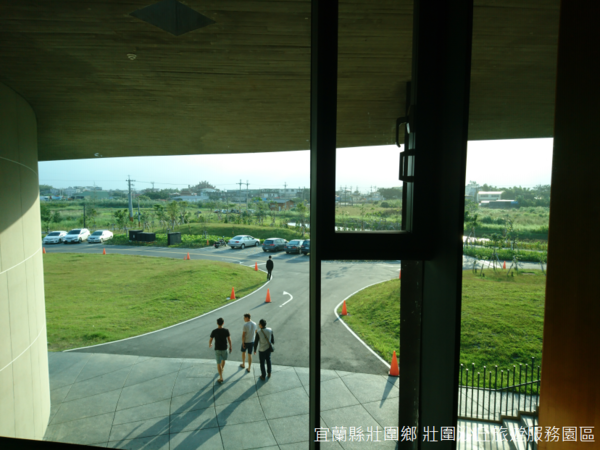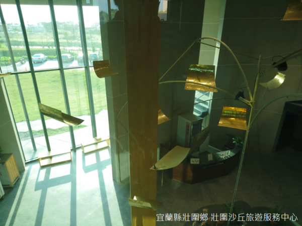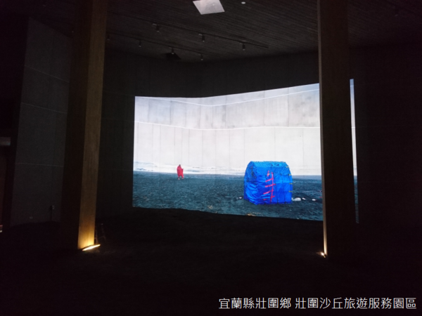 步出展廳,壯圍沙丘遊客中心的屋頂佈置固沙圍籬、鵝黃色小屋與眺望樓,其間草地如茵,草地順著斜坡滑下地面,面對大海的方向靜靜地躺著一灣池塘,池塘彼岸是高起的沙丘,沙丘上樹林蓊鬱,中有一座小屋。