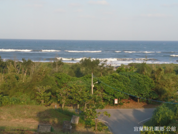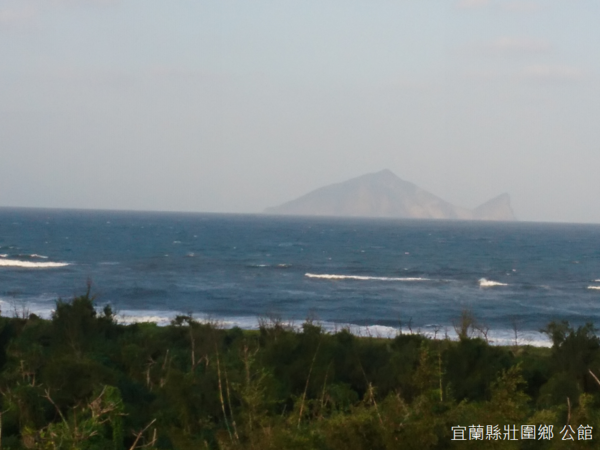 接近傍晚的天空,天色有些泛黃,樹林外的海洋拍打一陣陣浪花如雪,以往在宜蘭看到的大海,總是因為陰沉天氣,漂浮一層薄薄的銀箔,今天卻意外地呈現湛藍色調,甚至有著油畫般厚重、濃烈的質感,龜山島卻因為海上升起的霧氣有些模糊。