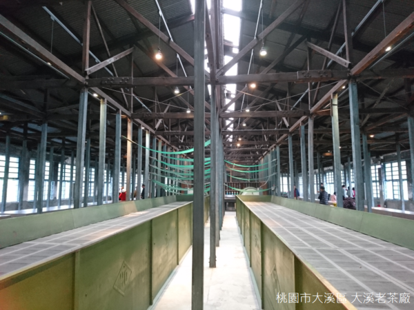 最顯眼的,應該是中央的茶葉萎凋設備,數量眾多的萎凋架,透露出早年茶廠龐大的外銷量,款式分為早期紅檜木製的萎凋架,以及後期使用尼龍塑膠網的萎凋架,為了讓茶葉不落地,使用時會將茶菁平舖於萎凋架上,再一層一層往上堆疊。