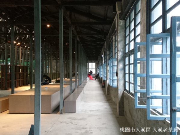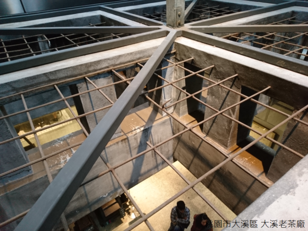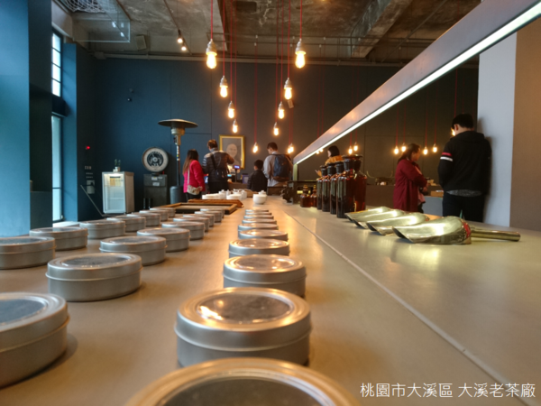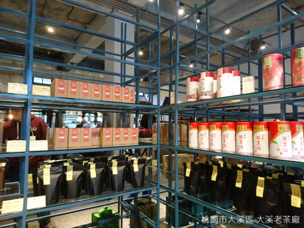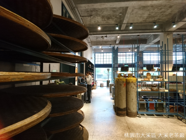 天氣濕冷,空氣中飄散一股青草芳香,曾經在竹山大鞍八卦茶園見過鐵皮搭建的廠房,也曾經在峨眉富興參觀焙製東方美人茶的古厝,大溪老茶廠又展現出不一樣的氣息,不只製茶,茶廠設置門市、餐廳、茶圖書館、茶屋等等空間,茶文物和茶製品陳列於鐵架上,以簡潔線條的輕工業風呈現,似乎也呼應茶廠結合自然農法和觀光工廠,集合傳統與現代於一體的理念。
